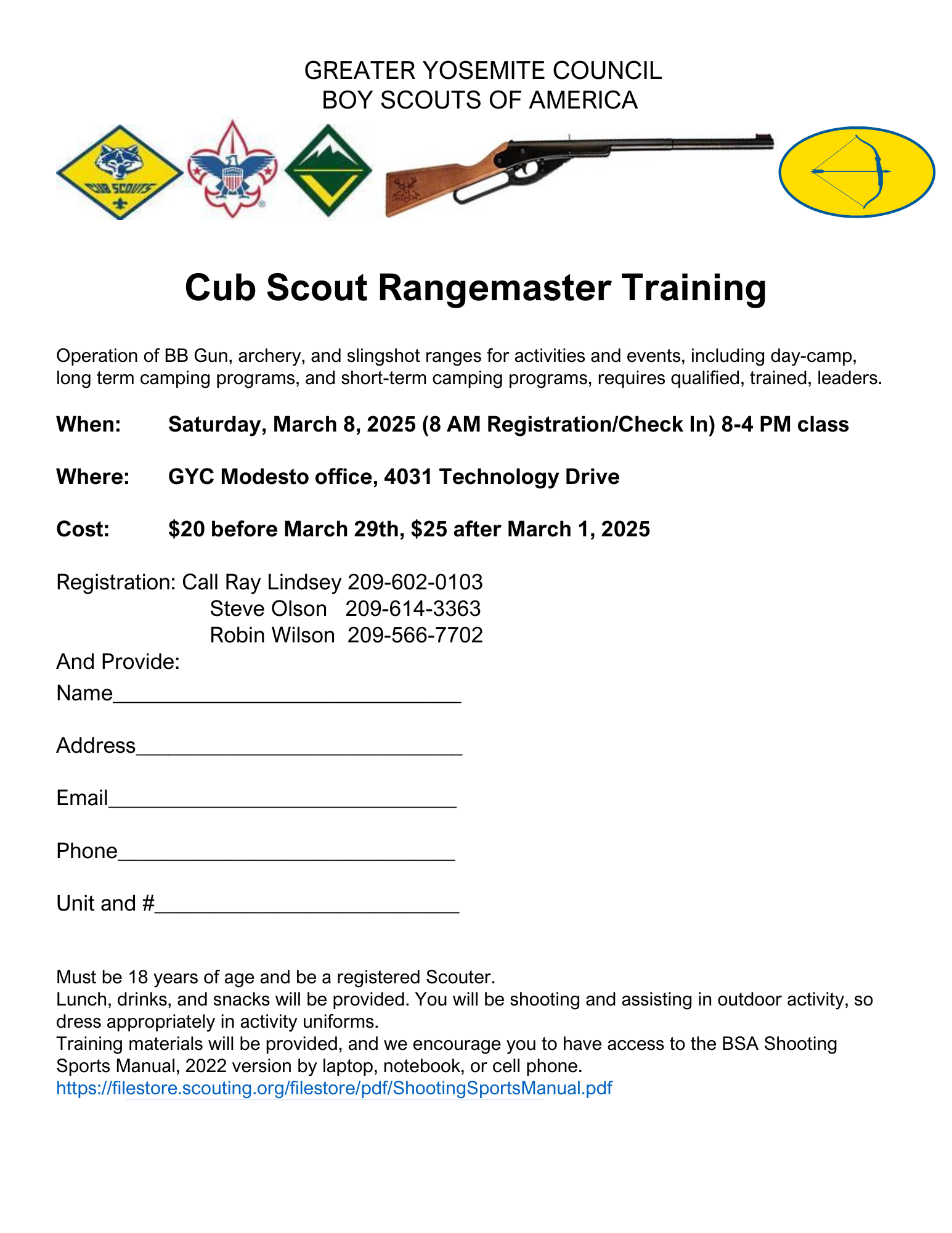 “This training is required for all staff and assistants at Cub Day Camps, and Cub and Webelo Resident Camps to conduct Archery and BB Gun Shooting activities and events. Archery gives the basics of Archery Instruction, safety, range operations, and shooting skills so you can run an effective Archery program for Cub Scouts and Webelos. The BB Gun Training portion teaches the basics of the BB Gun/pellet program instruction, range operation, and skills so you can run a safe and effective BB Gun program for Cubs and pellet program for Webelos.”