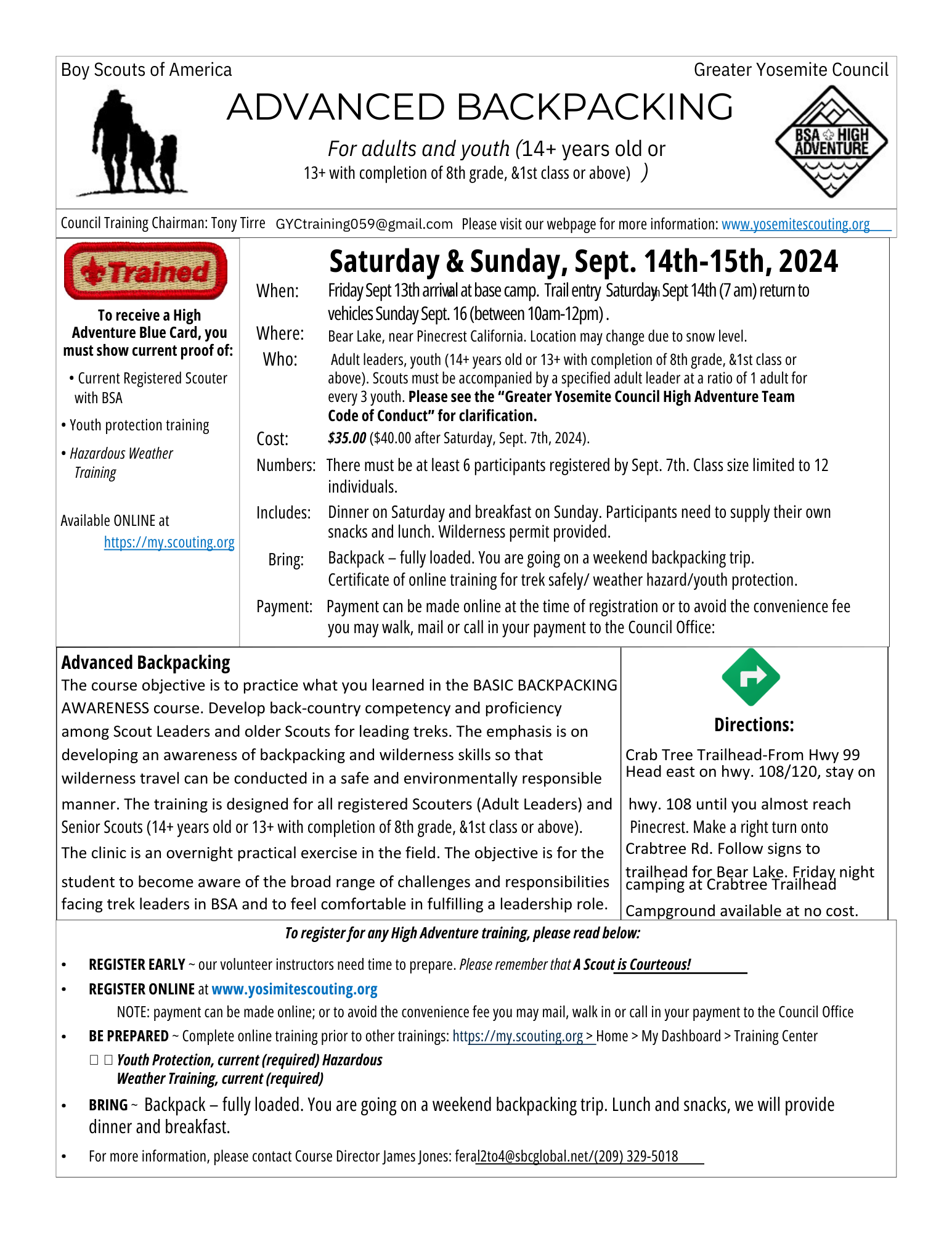 Youth (14 years old or 13 with completion of 8th grade & 1st class or above) must be accompanied by a specified adult leader at a ratio of 1 adult for every 3 youth.